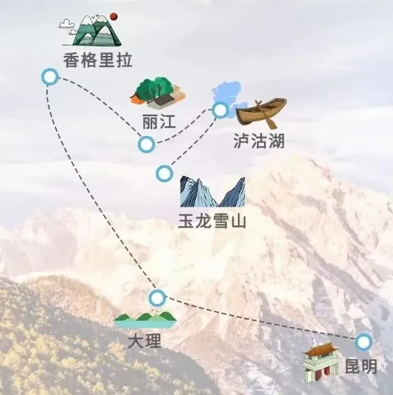 大理加丽江,时间长一点还可以加昆明,香格里拉和泸沽湖。非常适合第一次来云南的朋友,不同景点之间搭配可以玩4~7天,一口气看尽雪山,湖泊,古城,藏地风情。