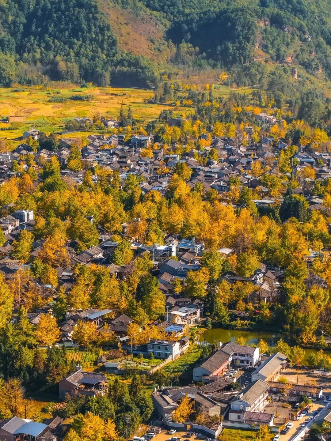 银杏村在秋季时很好看,村中房前屋后千年古银杏树的叶子完全变黄了。银杏叶层层叠叠,将村庄装点成了一个如梦似幻的金色童话王国。