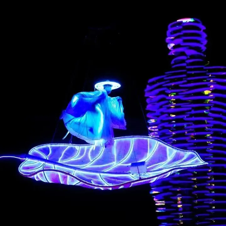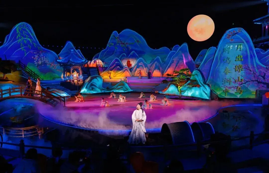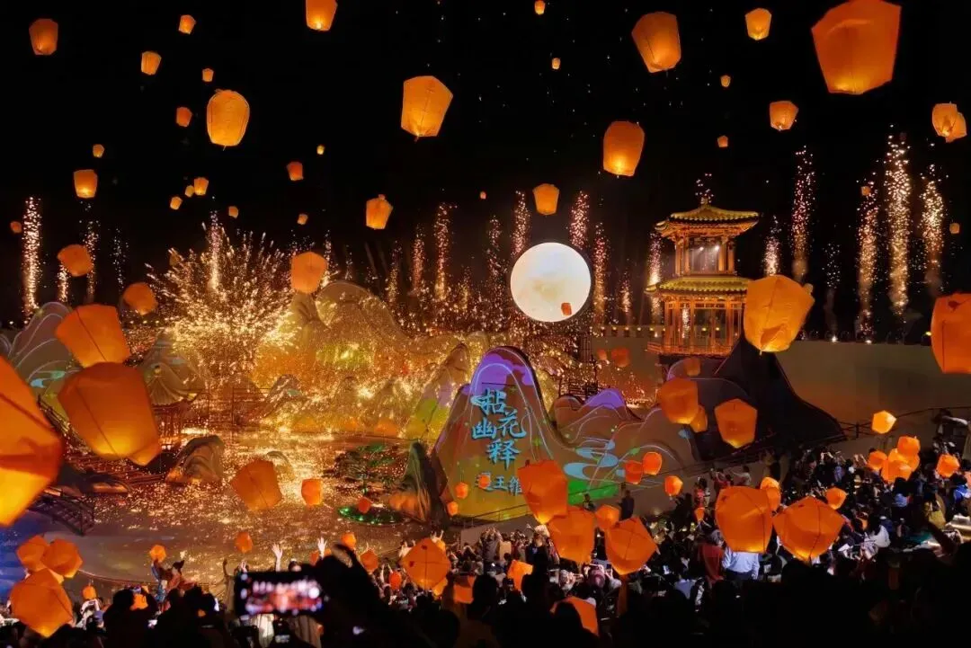 拈花湾全新沉浸式国潮盛宴《拈花许愿》,在花海许愿广场打造沉浸式诗意场景,亭台错落、光影流转,宛如一幅流动的山水画卷。