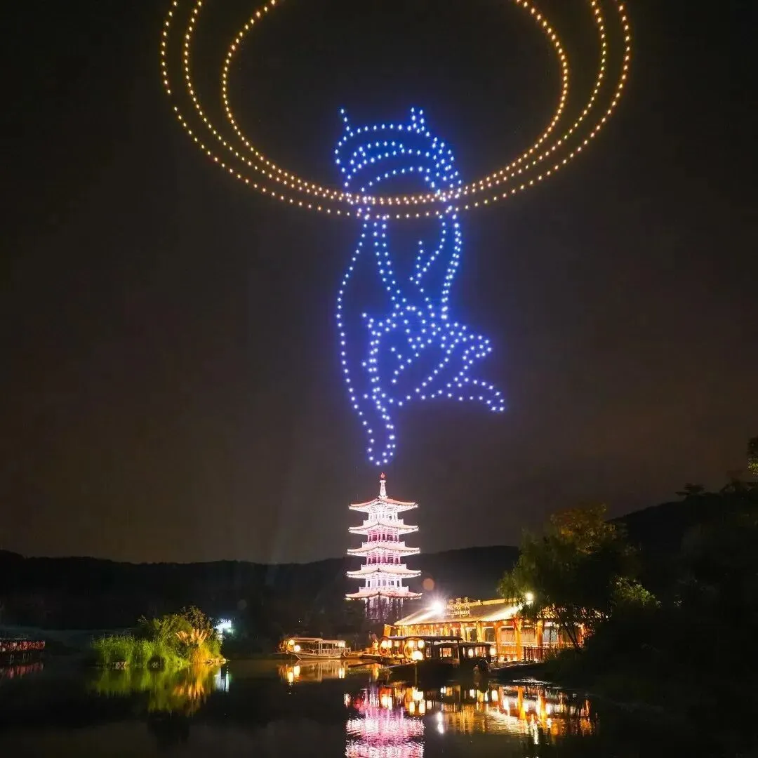 五一必看的视觉巅峰!拈花一笑无人机烟花秀,将东方美学与现代科技完美碰撞,2000架无人机腾空而起,以AI塔为轴,光影流转间,夜空中勾勒出拈花一指、莲花绽放等图案。