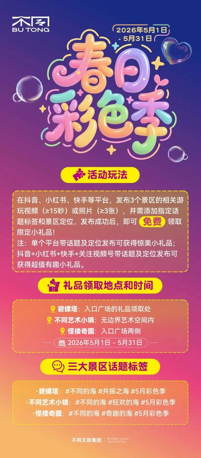 告别平淡春日,邂逅缤纷色彩!2026 年 5 月,不同文旅集团旗下三大景区联合打造春日彩色季主题活动,整月狂欢持续在线。