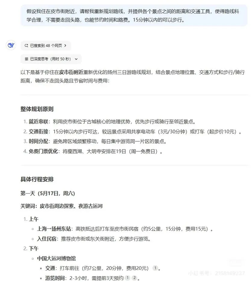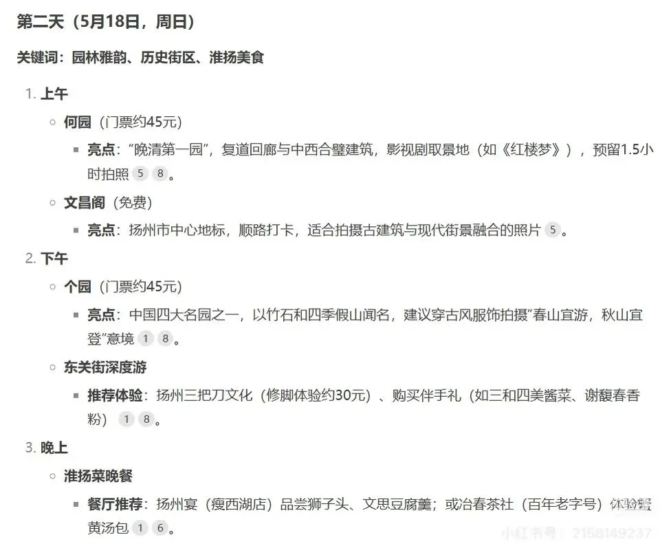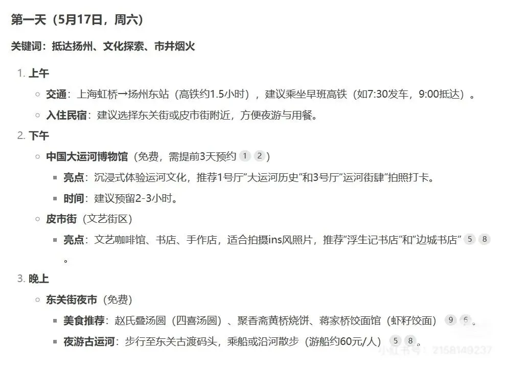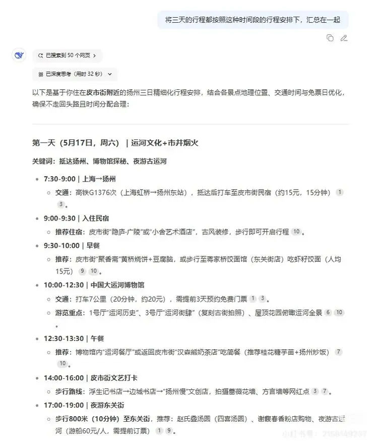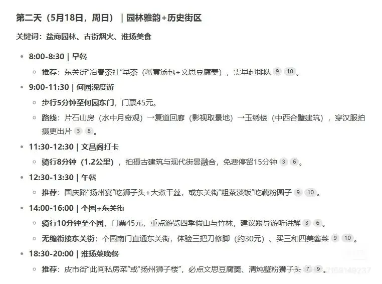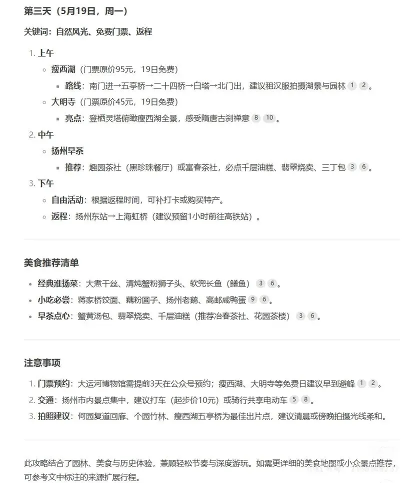 DeepSeek帮我制定了扬州三天两晚的攻略,经过实践,基本上可行,自己时间上可以灵活点哦。