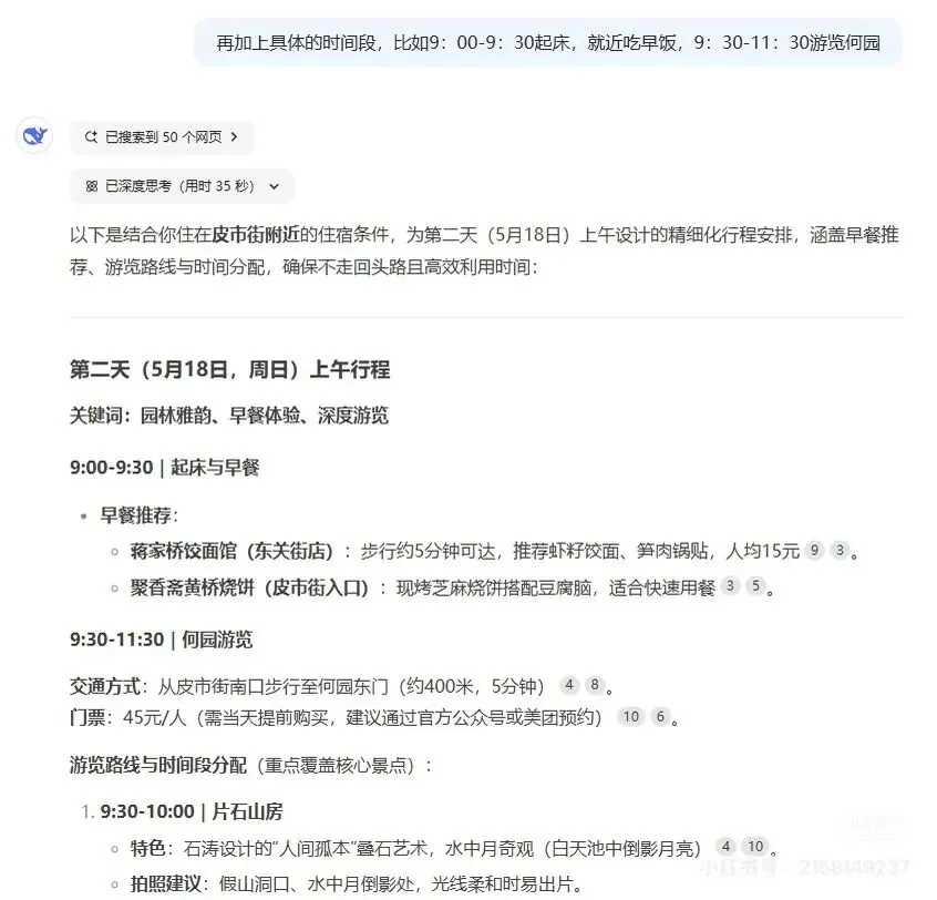 3.再根据DeepSeek的回答细化要求,比如行程安排上精确到时间段,交通时间估算等。