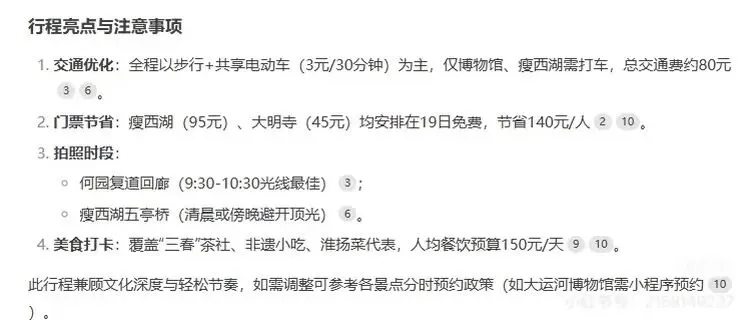4.最后让DeepSeek整合你要的信息,或者自己将重点内容提取出来,一份详细的旅游攻略就制定好啦。