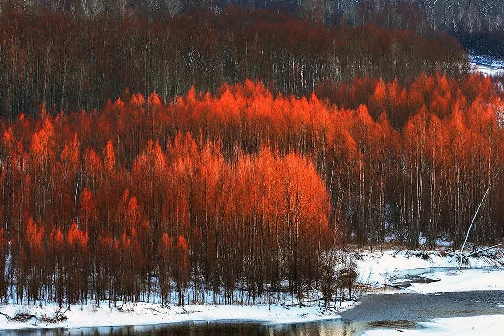 春日冰河半融,红柳迎风绽放,冰与火交织出大兴安岭独有的春日奇景。