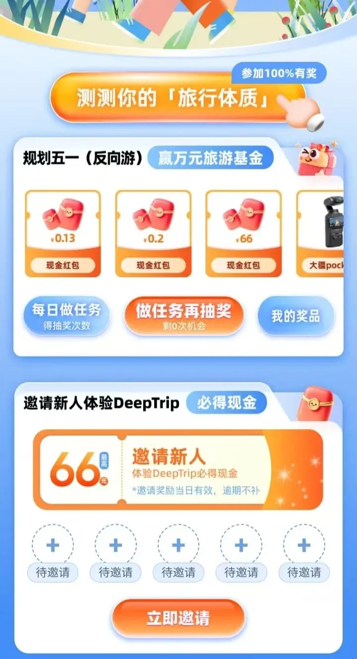 ↑↑上面入口进去,几秒钟测一下旅行体质,送一次抽奖机会,直接抽奖,必中微信红包。