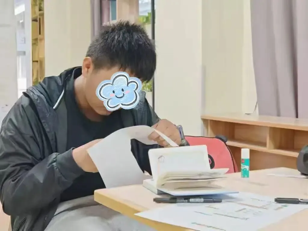 接下来是这堂课的“大活儿”:剪剪贴贴,做一本自己的旅行手册。小伙子们开始工作了。整个过程,有打趣,也有安静和专注。大家的“手工风格”各不相同:Xi哥和T老师先剪再贴,主打一个从容;Yiyi、wh和N哥剪一页贴一页,条条道路通罗马wh剪贴速度超快,可惜内页毛边超出太多,被“强制返工”;N哥紧随其后,又快又稳,妥妥的模范选手;Xi哥一边贴一边傲娇说“我这叫从容不迫”;Yiyi速度也不慢,但贴得太“潦草”,好多地方没粘牢,返工后居然成了全班最牢固的手账本。
