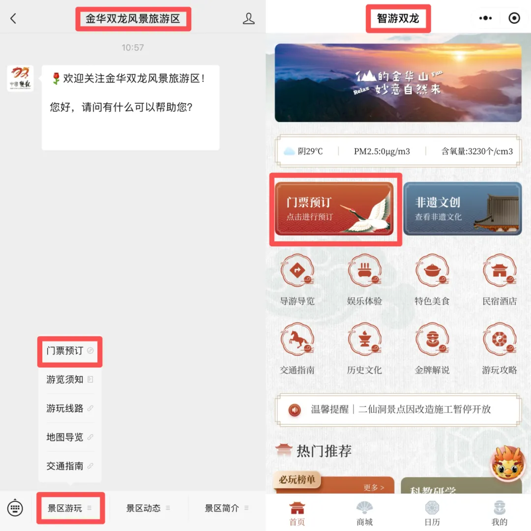 ①官方微信公众号“金华双龙风景旅游区”菜单栏【景区游玩】-【门票预订】;