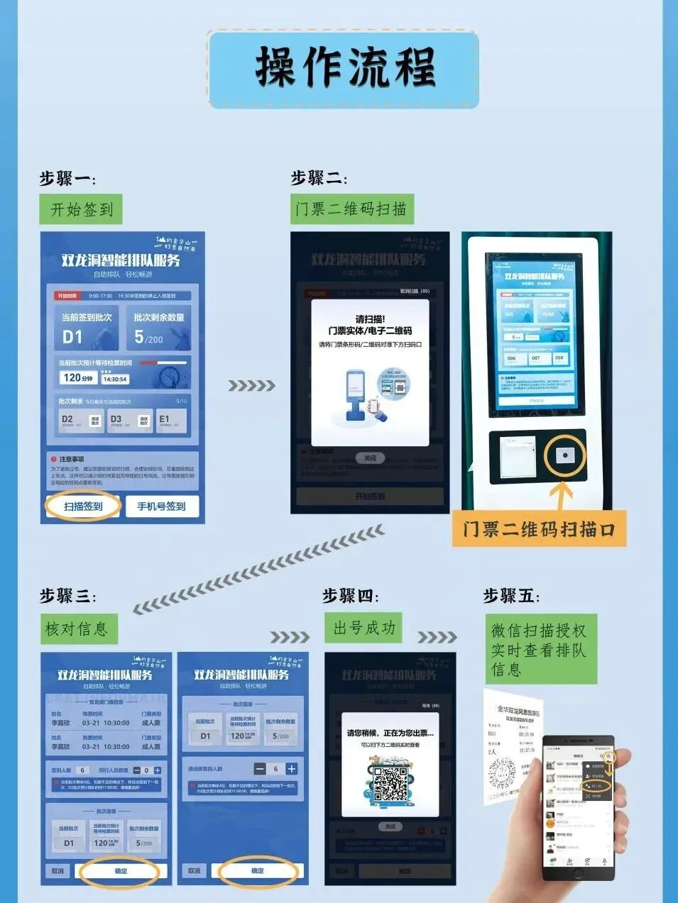 ②使用下单时登记的手机号/ 二维码到景区【智能排队服务站】签到取号,游客中心售票处/旅游咨询中心/双龙洞洞口/二仙补票点/仙瀑洞等点位均可签到