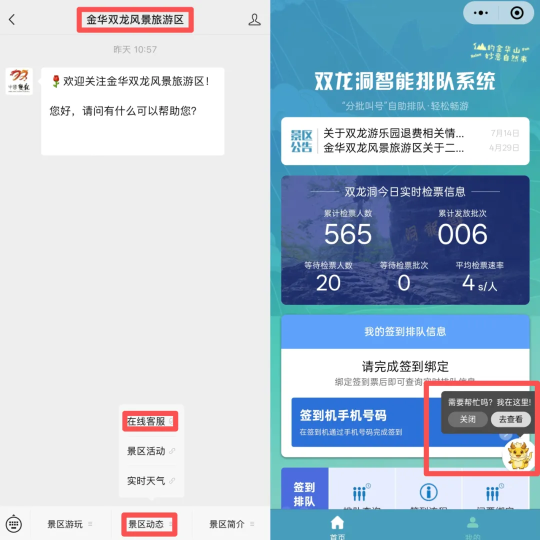 关注景区官方微信公众号“金华双龙风景旅游区”,可点击菜单栏【景区动态】-【在线客服】