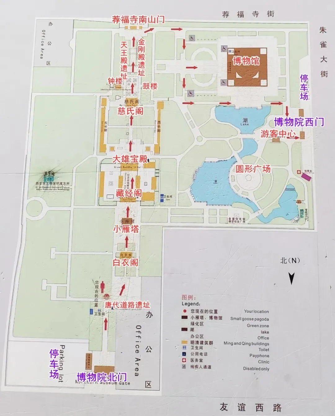 博物院北门→唐代道路遗址→白衣阁→小雁塔→藏经阁→大雄宝殿→慈氏阁→钟鼓楼→天王殿遗址→金刚殿遗址→西安博物院→博物院西门(或返回北门)