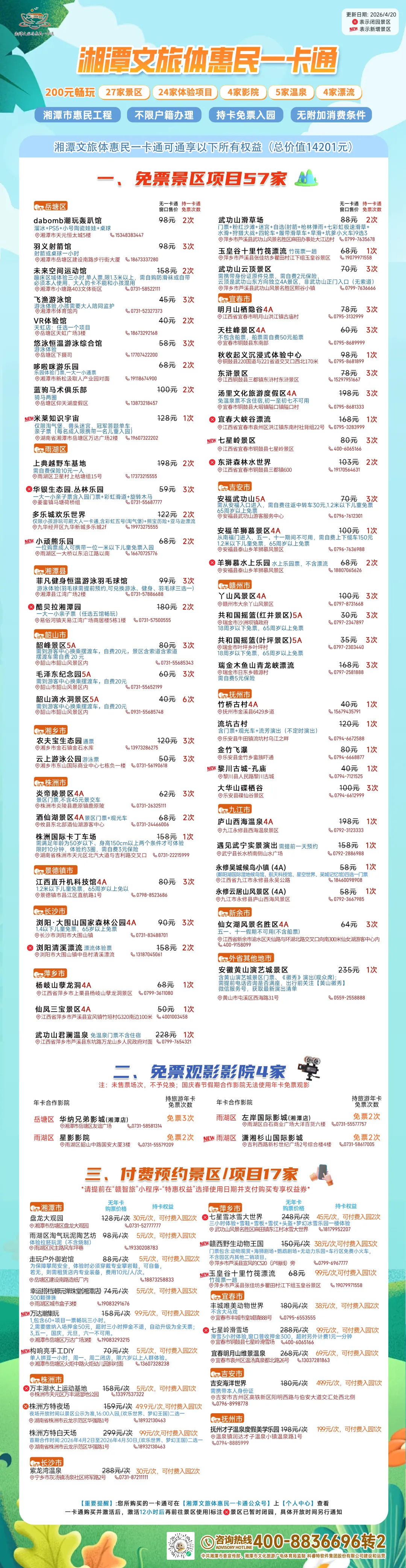 温馨提示:五一期间部分景区可能出现营业时间调整以及临时闭园情况,为了保障大家的出行体验及出行安全,进入景区/项目请带好个人身份证,提前电话咨询景区营业状态。出行前请随时关注公众号以及微信会员群内消息,注意查看景区/项目通知(进入湘潭文旅体惠民一卡通微信公众号,点击菜单栏“一卡通”-“合作景区”查询相应景区信息)。如使用一卡通过程中遇到任何问题,可拨打客服热线400-8836696-2(工作时间:08:30-21:00)