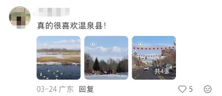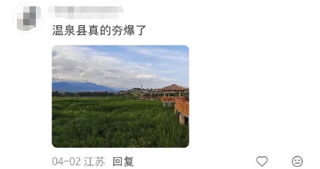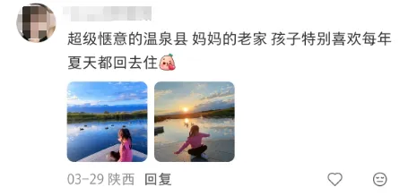 “温泉县真的夯,疯狂推荐身边所有人去!”“温泉县是理想中的童话小镇。”“去年过年去的,很舒服的一座小县城。”“每年夏天几乎都会去温泉避暑,很舒服。”“我太同意了,温泉真的太好看、太安静了。”“每年都去一次,非常爱这里。”