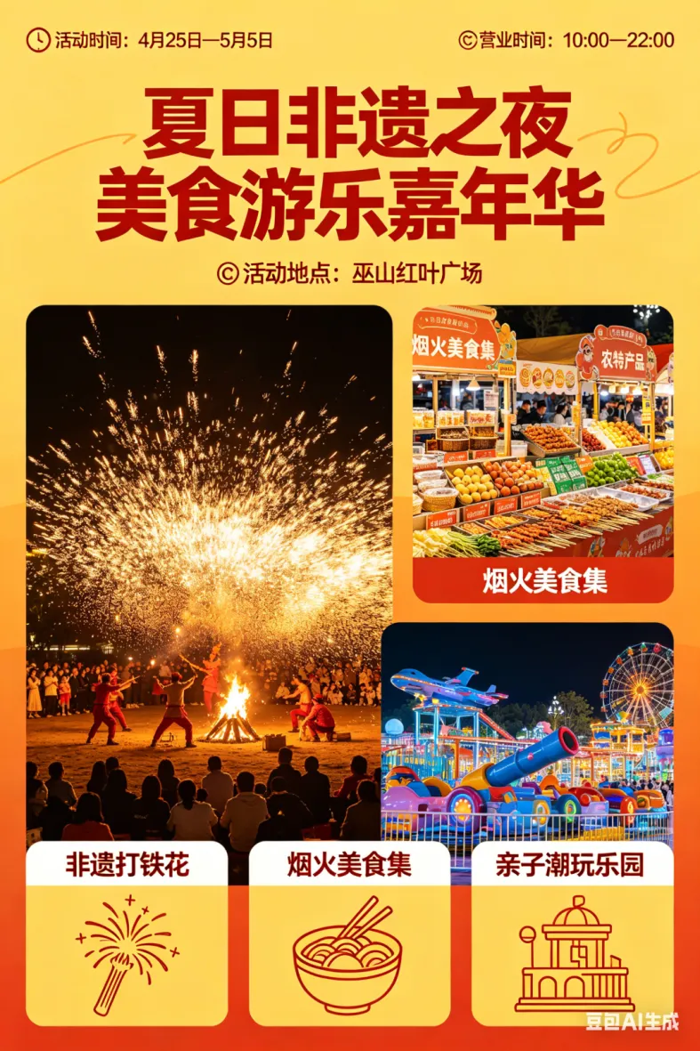 千年绝技打铁花凌空绽放,火壶非遗表演燃动夜空,更有热闹篝火晚会,流光溢彩点亮巫山夜色。