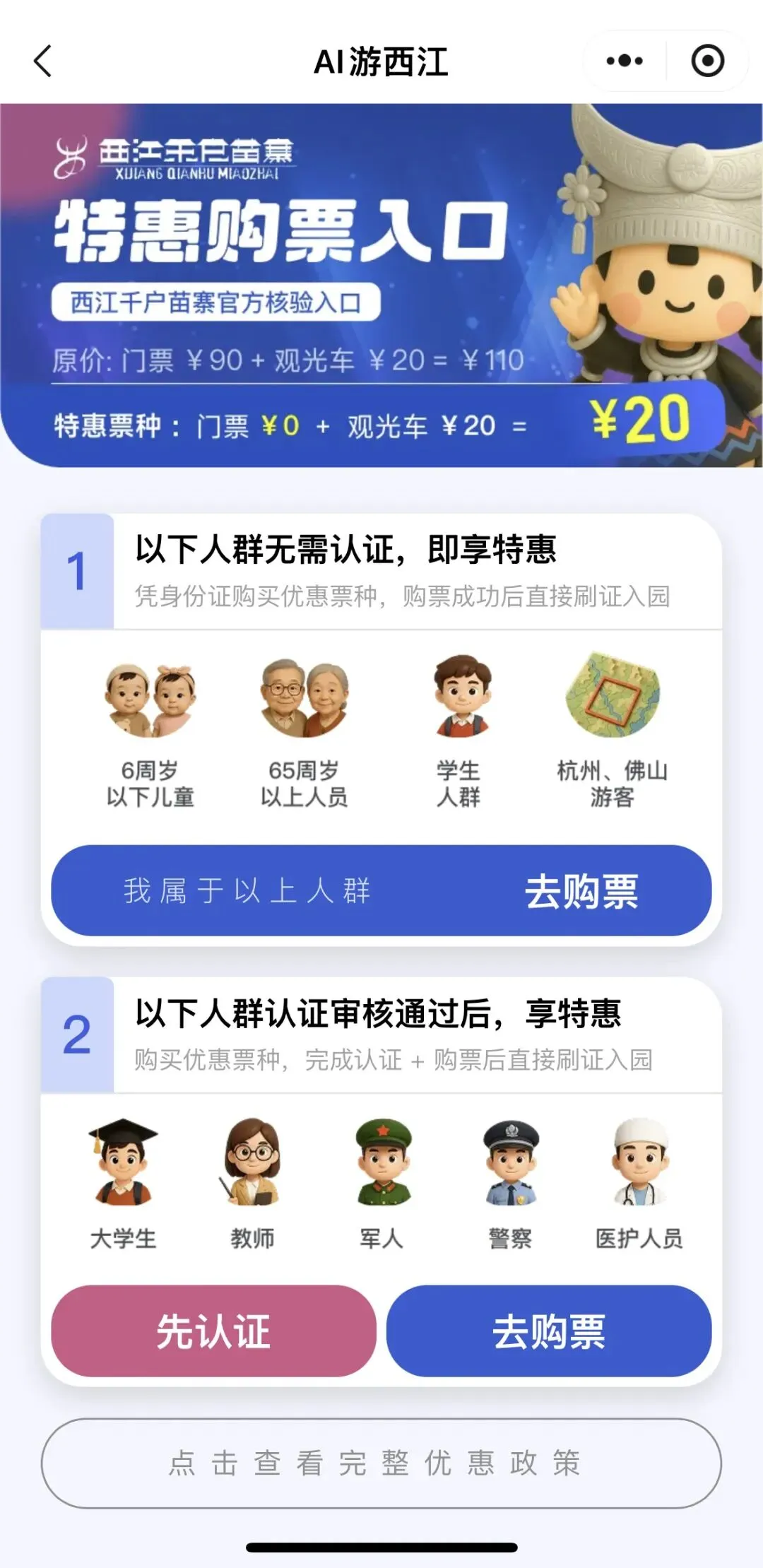 2.特殊证件办理:针对享受门票优惠政策的特殊证件(包括军官证、记者证、残疾证等免票证件,以及学生证、护照、港澳台地区相关证件),可通过线上登录“AI游西江”或“一码游贵州”平台,上传相关证件完成认证后购票或线下携带有效证件前往现场窗口直接办理免票手续。
