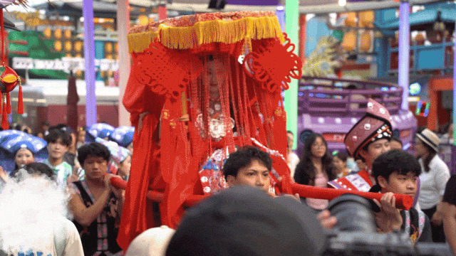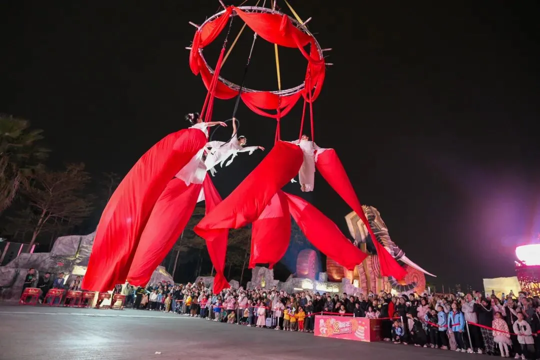 宫灯光影映衬着精心绘制的“漓江百里图”,壮族阿妹在空中撒花送福起舞,带你邂逅一场奇妙的桂味浪漫。