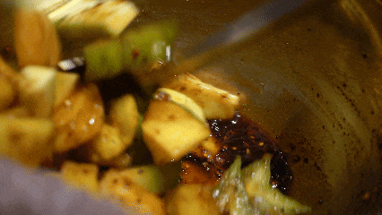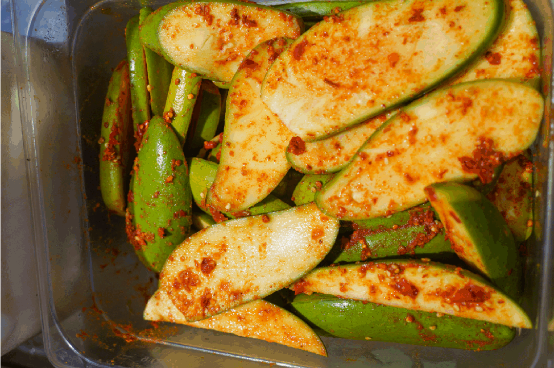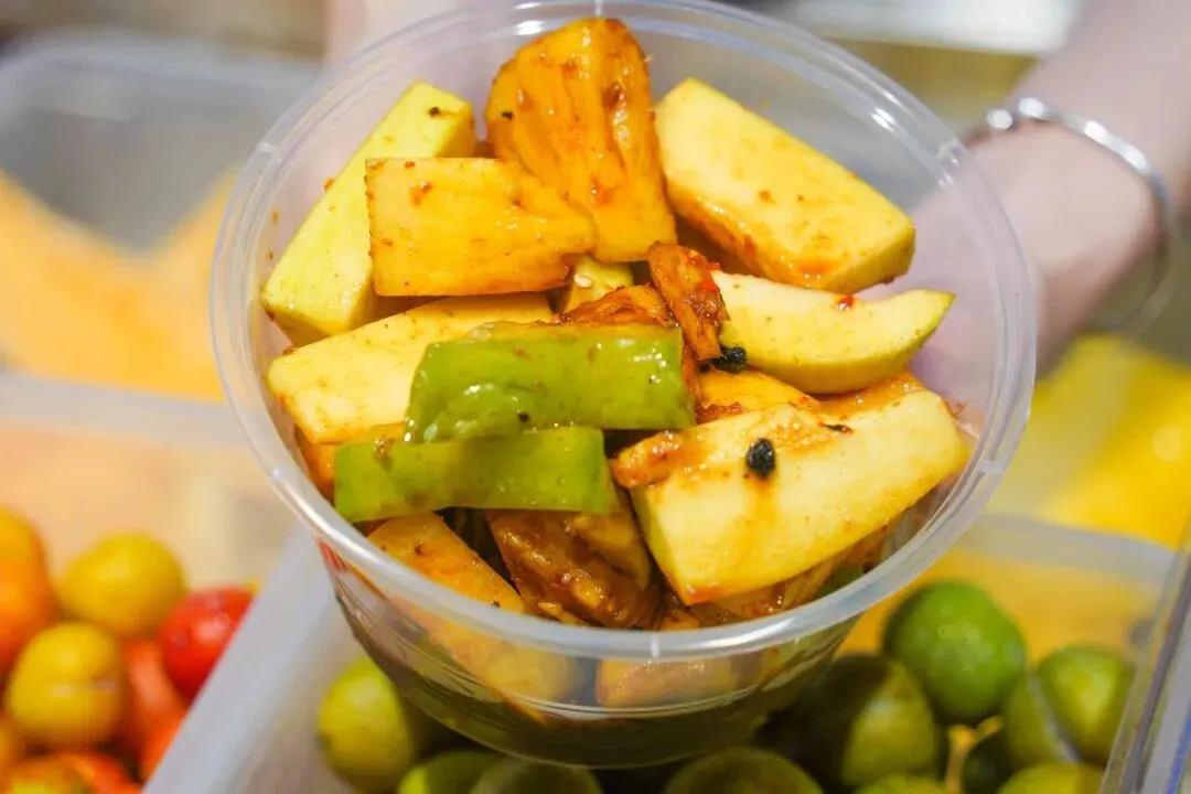 还有芒果、菠萝、番石榴、杨桃等不同的水果酸嘢,裹满红糖调料的酸嘢在容器中翻滚,调料均匀地包裹着每一块水果,咔咔上头,好吃的让人龇牙咧嘴。