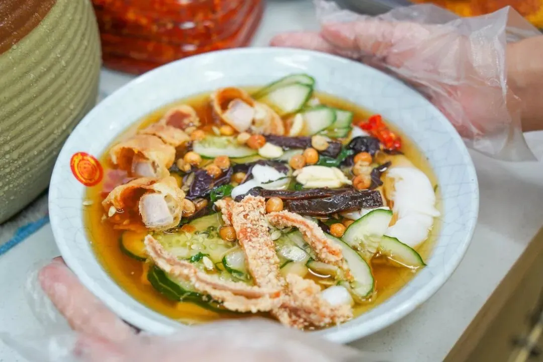 冰镇过酸甜的糖醋汁,浸着大片切粉、脆皮烧排、牛巴、黄瓜酸、花生、小米辣椒、蒜米,料满满一大碗。
