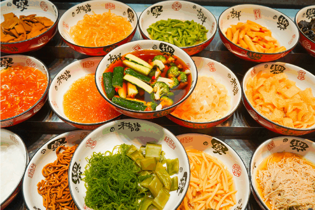 豆皮、莲藕、海带、鱼皮、鸡爪……十几种荤素搭配的凉拌菜,五颜六色,解腻又爽口。