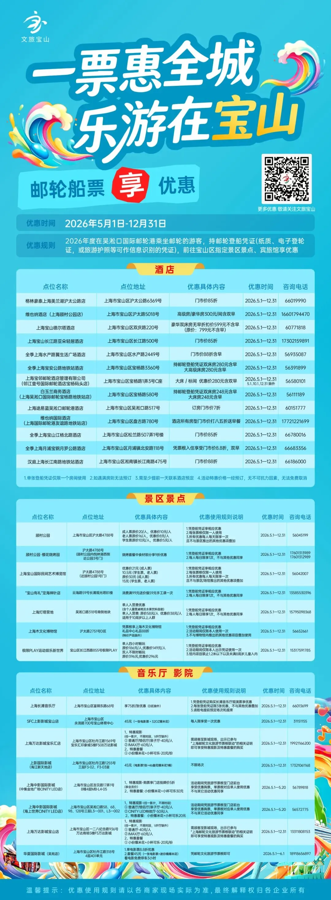 凭2026年邮轮船票,享宝山全域“住、游、娱、购”多重专属优惠:酒店升级、景点门票折扣、影院福利……一张船票,玩转整座城。