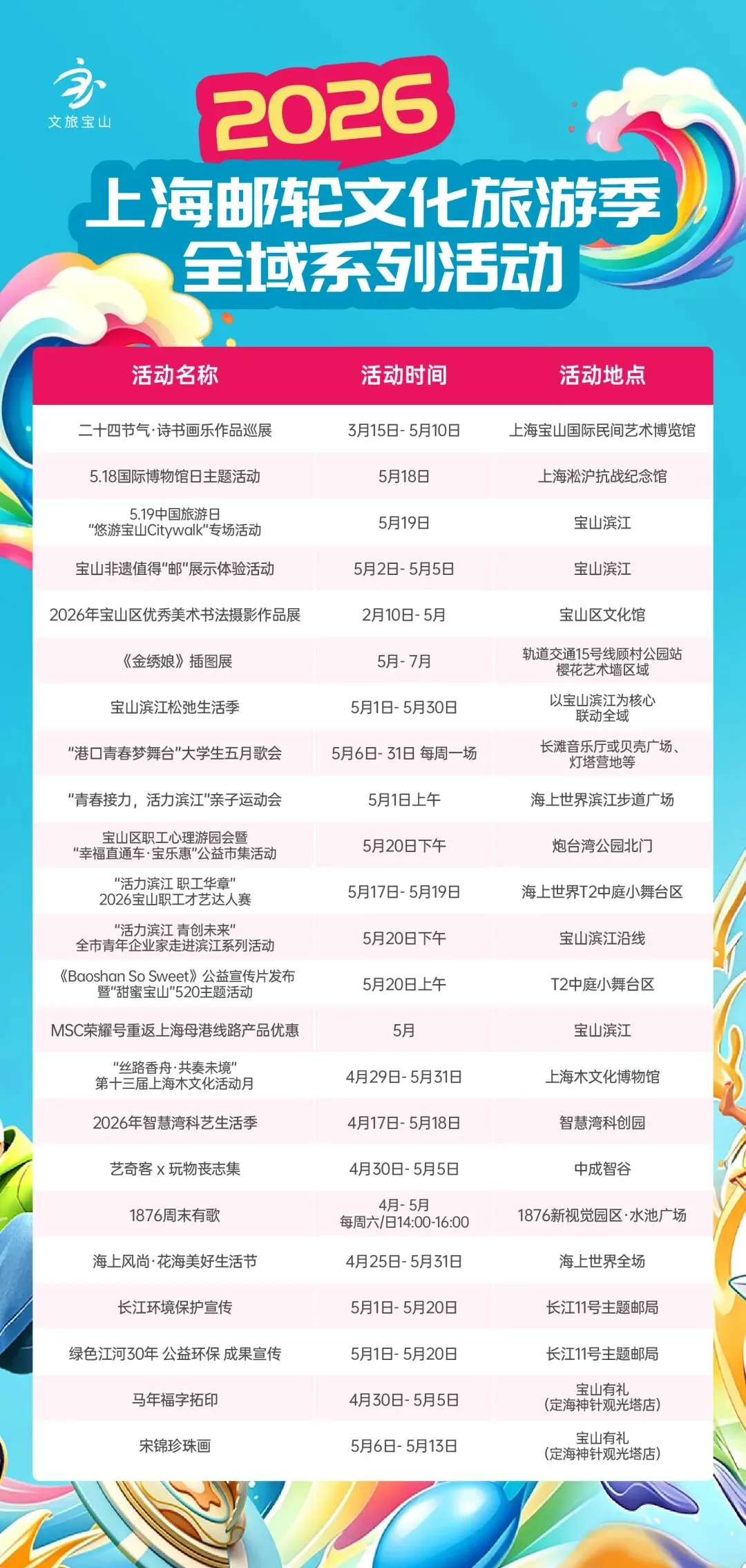 除了12项主题活动,整个五月,宝山全域还有近30场精彩活动等你发现——从博物馆的展览手作到文创园区的市集演出,从文化场馆的主题活动到滨江商户的假期限定,走到哪里都有惊喜。更多详情,看这张表就够了↓