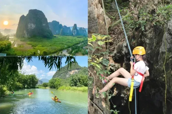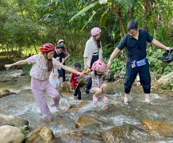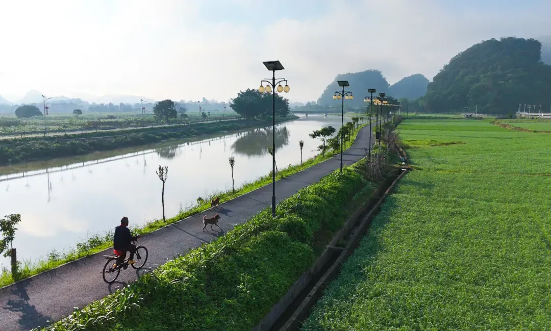 下午:租电动车骑行15公里环线 🛵带娃骑上“小电驴”,沿峰林绿道慢慢开。一路经过稻田、桑田、小赵州桥,随手一拍都是壁纸!娃坐在前面开心到尖叫~