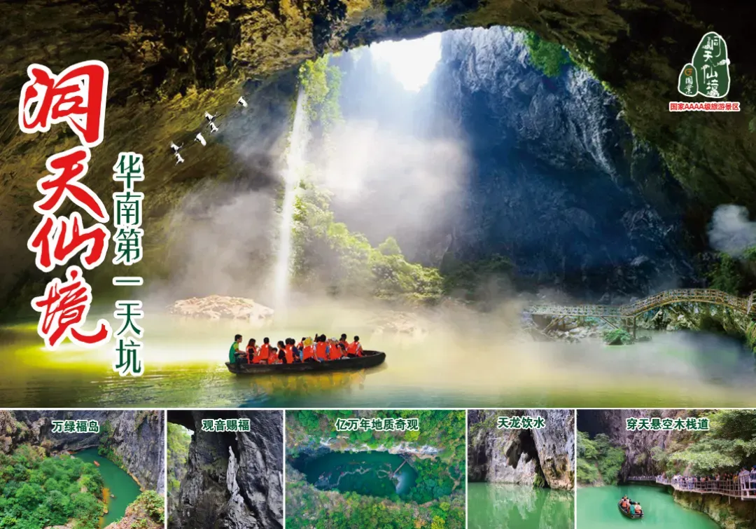 洞天仙境“天坑”是一种世界罕见的喀斯特地形独有的地质景观——喀斯特溶洞,形成于2亿多年前,形如一个巨大的漏斗天窗,具有极高的旅游探险价值和观光价值。