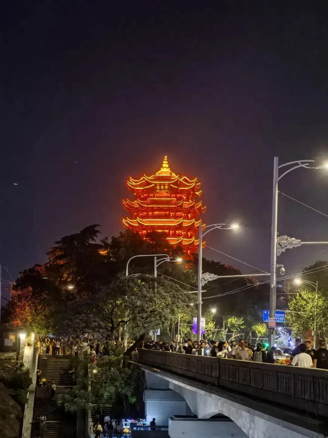 1️⃣⚠️黄鹤楼站位于五号线—司前门黄鹤楼站,从A出口出来就能看到黄鹤楼。如果想看正面,出站之后往右走啊,到路口过马路再往左拐,一直直走,右手边有个楼梯上去,那里就是最佳机位。