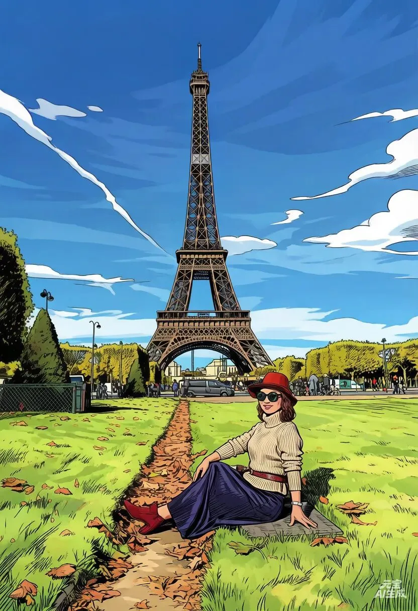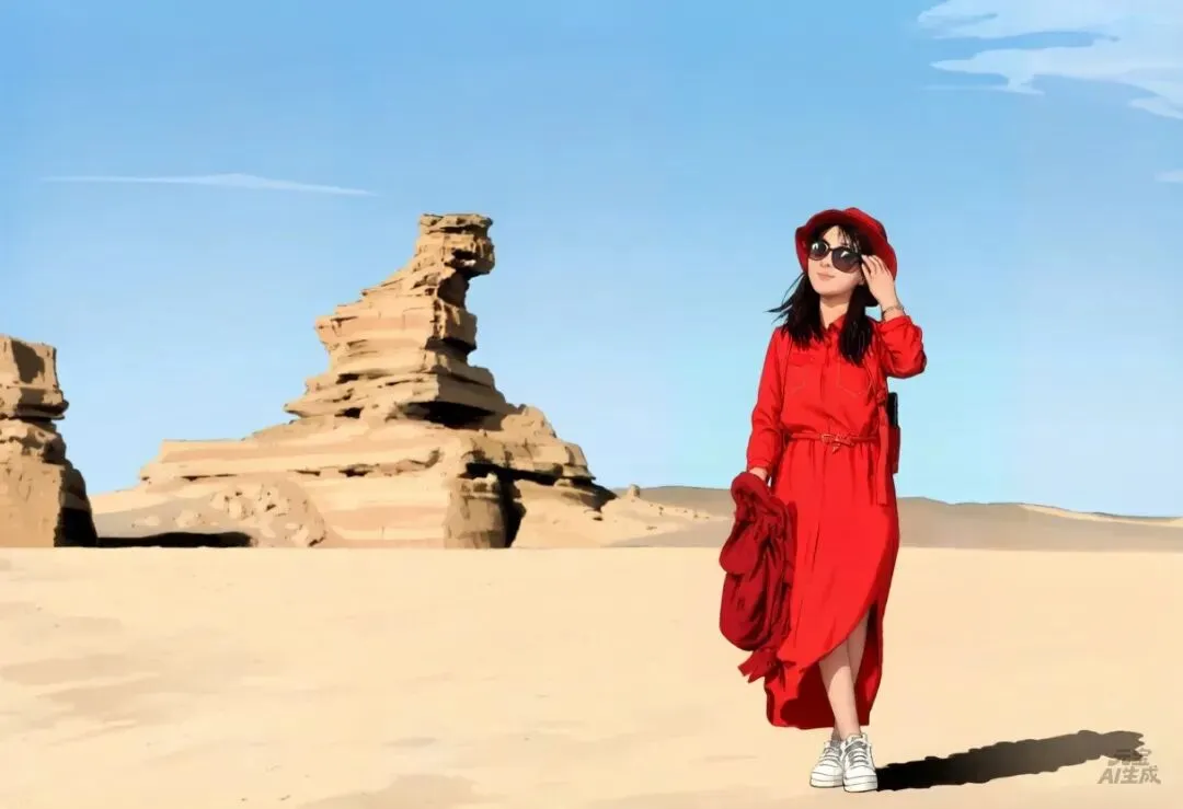 千万年的烈风如无形刻刀,在雅丹群峰间雕出城阙、殿宇与巨兽的残影,它们静默地站在大漠的聚光灯下,在日暮时分燃烧成一片金红色的火海。 服装:红色长裙+红色帽子+墨镜 搭配思考:大胆使用高饱和度的纯红色,在色彩单一的大地色系中,形成视觉冲击。 场景五:巴黎埃菲尔铁塔(浪漫之都的地标)