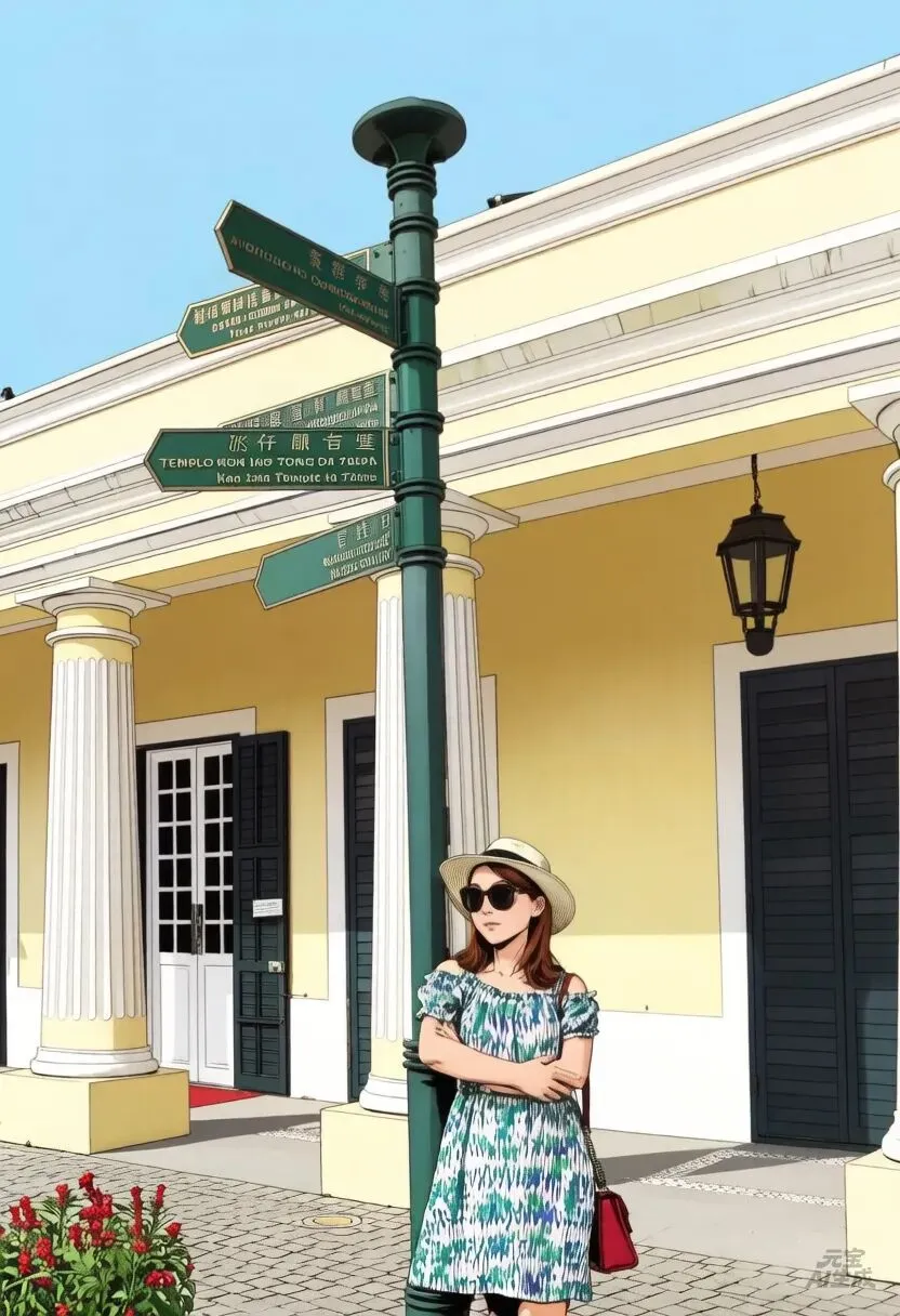 服装:白色长裙+草帽 搭配思考:轻盈简洁的白纱裙,与背景的粉色草丛形成明暗对比,视觉上干净、通透,打造清新治愈的田园风。 场景八:澳门龙环葡韵