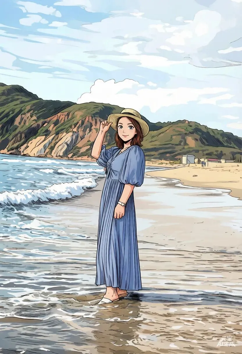 服装:雾霾蓝色长裙+草帽 搭配思考:在蓝天大海的背景下,低饱和度的蓝色长裙随风微动,如同海浪般摇曳。