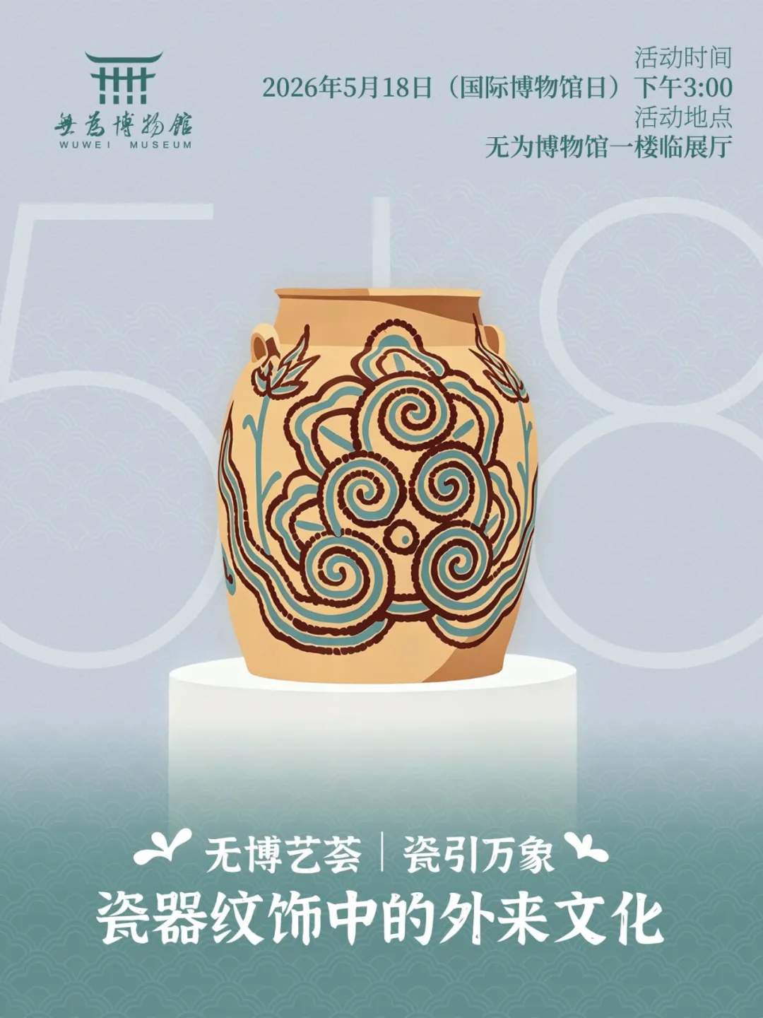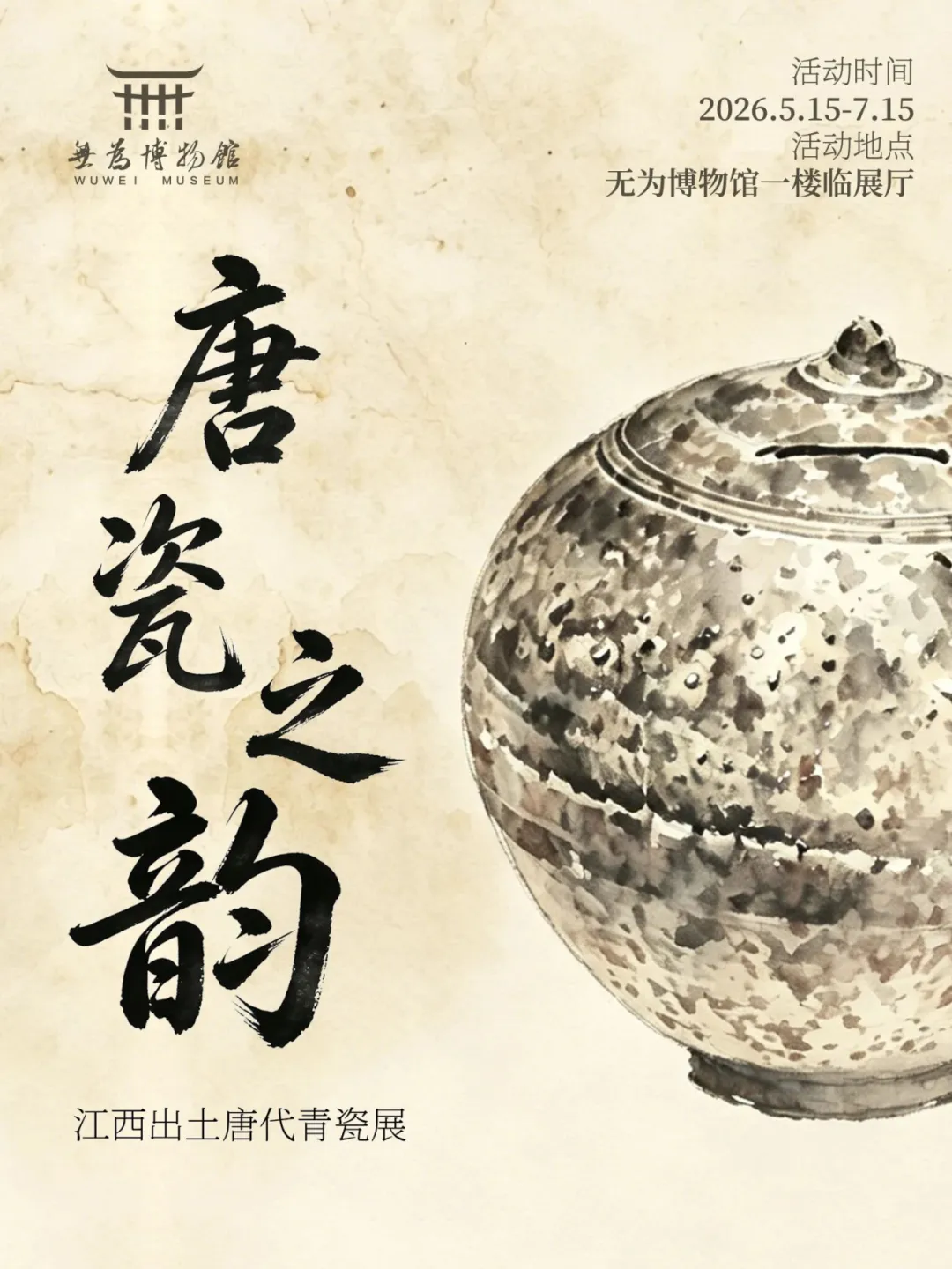 2026年国际博物馆日主题为“博物馆:连接世界的桥梁”。瓷器作为中国标志性文化名片,在漫长发展历程中融合了诸多外来文化元素,形成了独树一帜的艺术风貌。恰逢馆内正在举办“唐瓷之韵-江西出土唐代青瓷展”,本次活动将带领大家近距离感受古瓷魅力。5月18日,让我们一起走进无为博物馆,探寻瓷器里的外来印记,了解纹饰背后的文明密码,亲手在高白土陶瓷素坯上创作绘画,绘制一件属于自己的陶瓷作品,沉浸式感受中外文明交流的独特魅力。