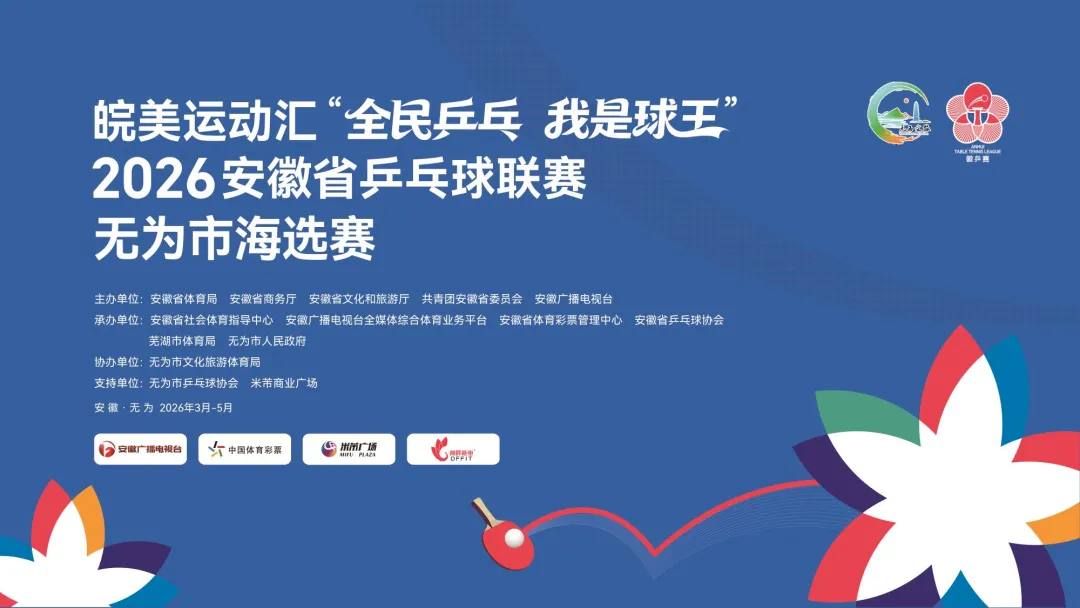 🥰活动内容:“全民乒乓 我是球王”2026安徽省乒乓球联赛无为市海选赛于2026年3月-5月在无为市举行;比赛分为少儿组单打、公开组男子单打女子单打、家庭组团体。采用“擂台赛”方式,随机确定出场顺序。每场比赛“一局定输赢”,失败者不得再次参加本周比赛。各组别在当日连续守擂规定场次成功者中决出“周球王”。家庭组可根据报名情况决定赛制,决出“周球王家庭”。海选赛全部结束后,组织所有“周球王”开展“球王争霸赛”,冠军获得“县球王”称号。