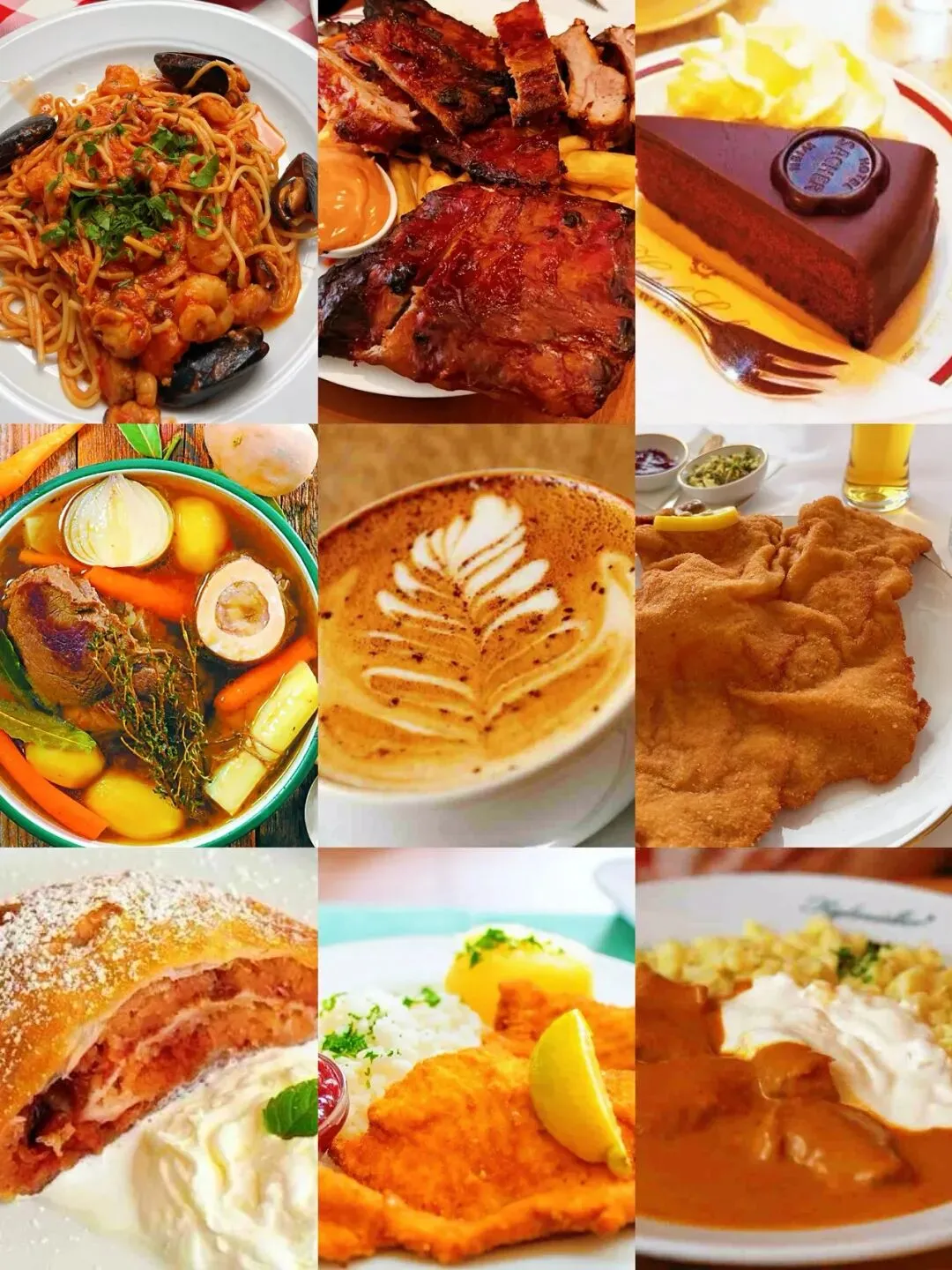 1️⃣维也纳炸肉排(Wiener Schnitzel):奥地利国菜,薄小牛肉(或猪肉)裹面包糠炸至金黄,外酥里嫩,配柠檬和土豆沙拉,推荐。