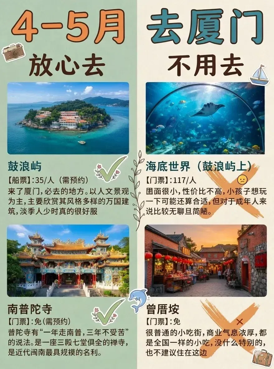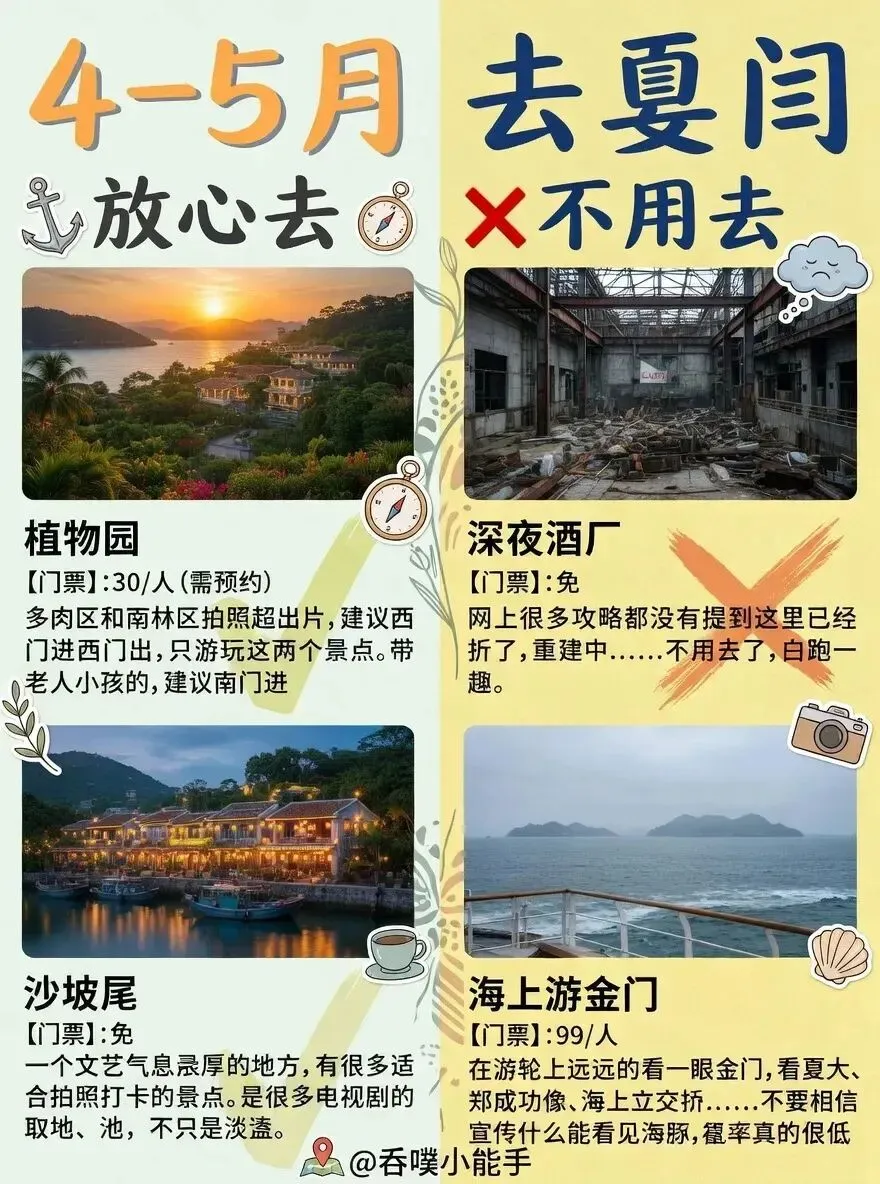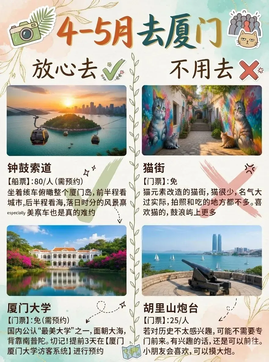 厦门旅游旺季(4-5月)天气晴朗,建议提前一周预订住宿,合理安排行程,避开人潮高峰。这份攻略结合本地人实测,确保游玩体验,祝你在厦门玩得尽兴!