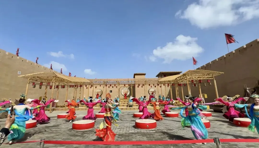 古风建筑错落,瓮城、宫城尽显汉唐风韵。沉浸式演艺还原丝路古韵,古街、城墙、民俗体验,一秒穿越千年。