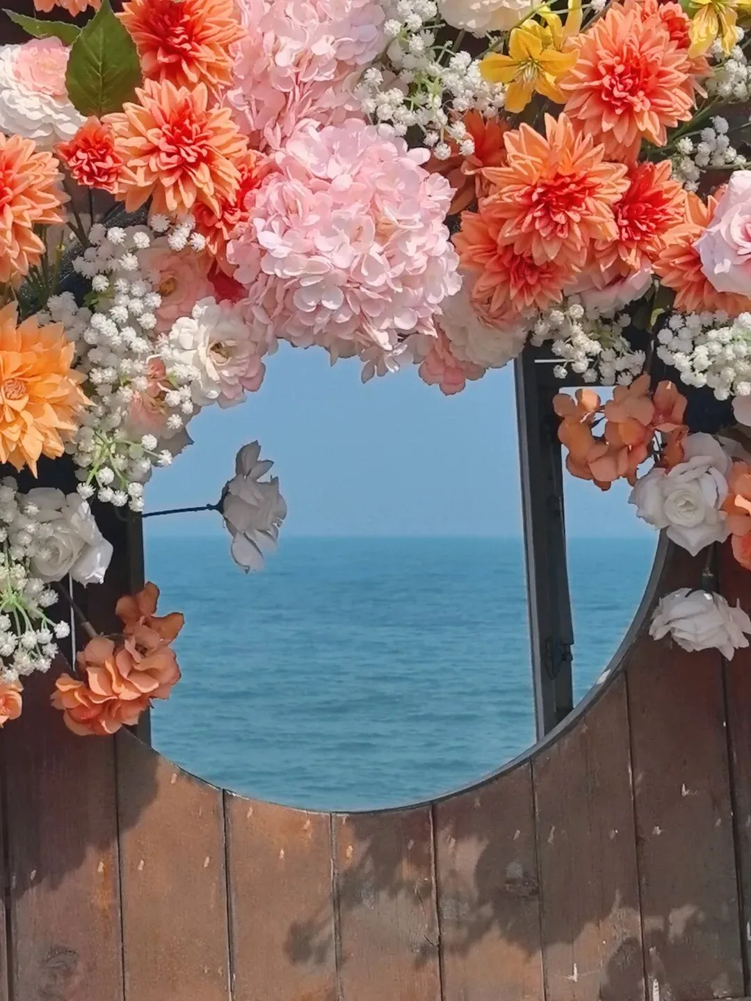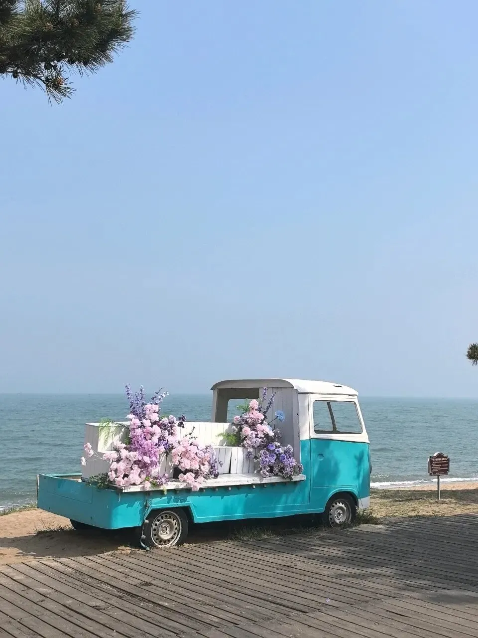 再往前走,徒步途中有最出片的点位,建议多预留时间拍照。这里有专属婚拍基地,马卡龙色系布景,核心打卡点包括:天空阶梯(延伸至海边,站在阶梯上,背景是蓝天碧海,拍出延伸感大片)、爱心秋千(坐在秋千上,抓拍自然笑容,日系清新风轻松拿捏)、LOVE雕塑、巨型花束、三角玻璃房、风车等,随便一个角落都能拍出ins风、情侣风大片,原图直出无压力。