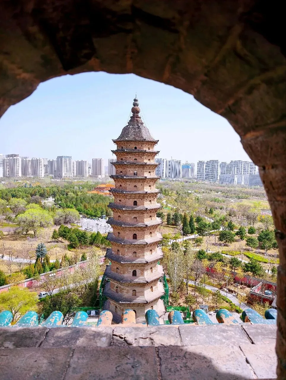 宣文塔(西塔):可攀登,螺旋石阶陡峭狭窄,体力不佳者慎爬;登顶俯瞰太原,视野绝了!