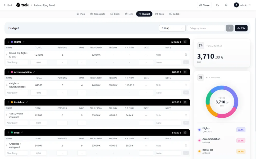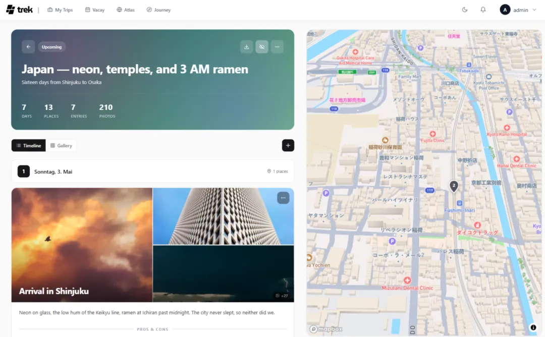 一款可自行托管的旅行/行程规划工具,具备实时协作、交互式地图、渐进式网页应用(PWA)支持、单点登录(SSO)、预算规划、行李清单管理等诸多功能。