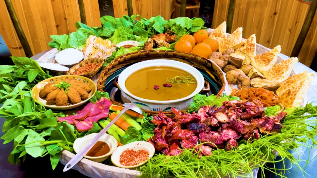 带有历史文化的土司宴是当地的特色,烤山鸡、烤鱼、排骨、五花肉等十余道菜肴铺在荷叶簸箕里,堪称天全版“满汉全席”。