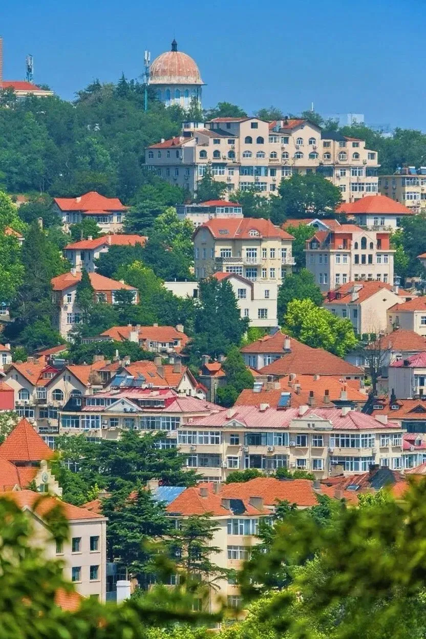 红瓦绿树与碧海蓝天相映