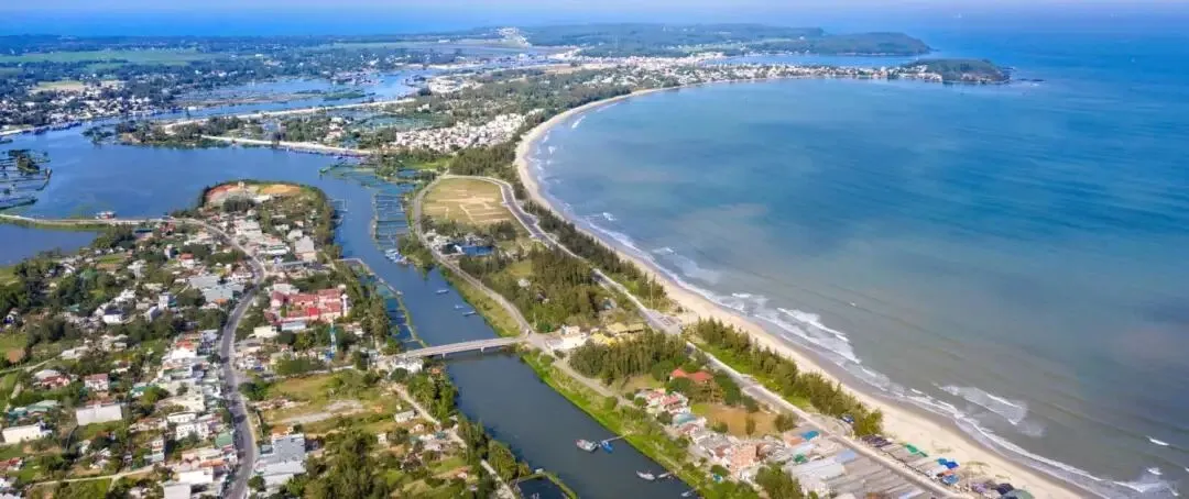作為越南第一座煉油廠的所在地,榕桔沙灘(Biển Dung Quất)仍保留著罕見的原始與寧靜之美。這裡的沙灘綿長、沙質細膩、海水清澈、波浪輕柔,且不擁擠——非常適合沿海騎行、悠閒散步或在午後進行輕鬆的野餐。現代工業空間與自然景色的融合,構成了榕桔海域獨有的畫面。
