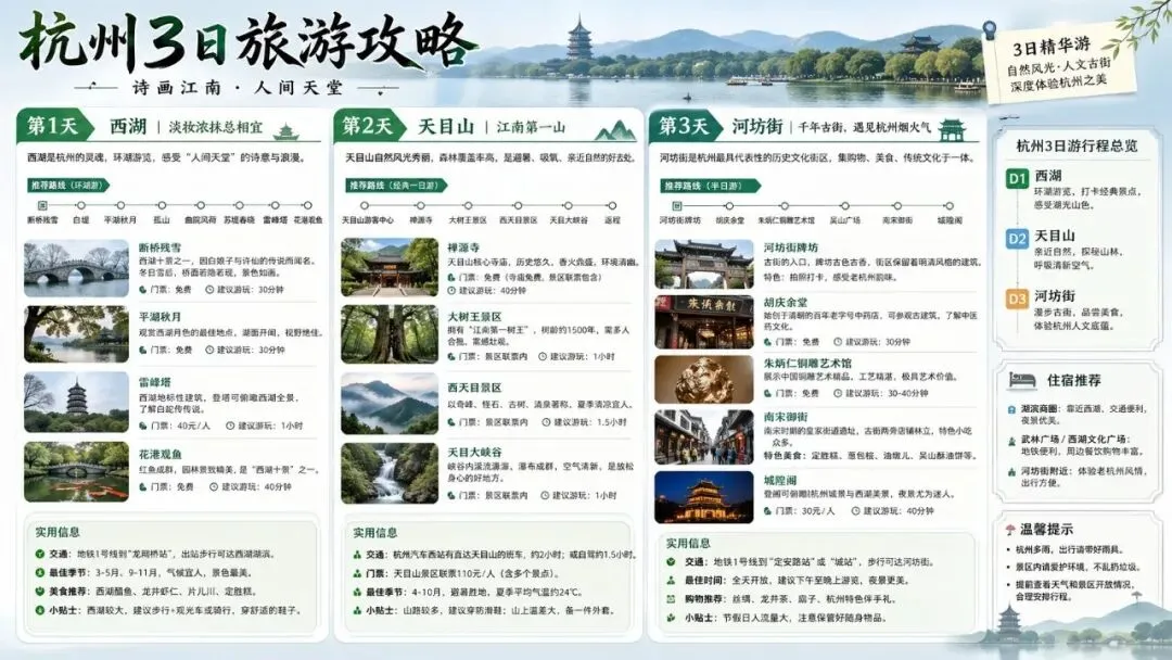 帮我生成一份杭州3日旅游攻略图,要求将每一个景点都介绍清楚,信息丰富。第1天:西湖。第2天:天目山。第3天:河坊街。横屏16:9,文字不乱码。