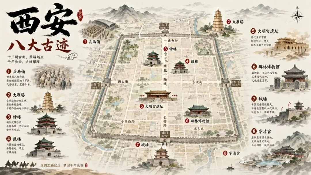 一张横板中式水墨风旅游海报,主题为西安,画面比例 16:9 。 画面以鸟瞰视角的简化城市地图为底,标注主要道路和地标。画面左上角为醒目的艺术书法标题“西安八大古迹”。每个古迹标注序号、名字和极简介绍,配代表性的插画。