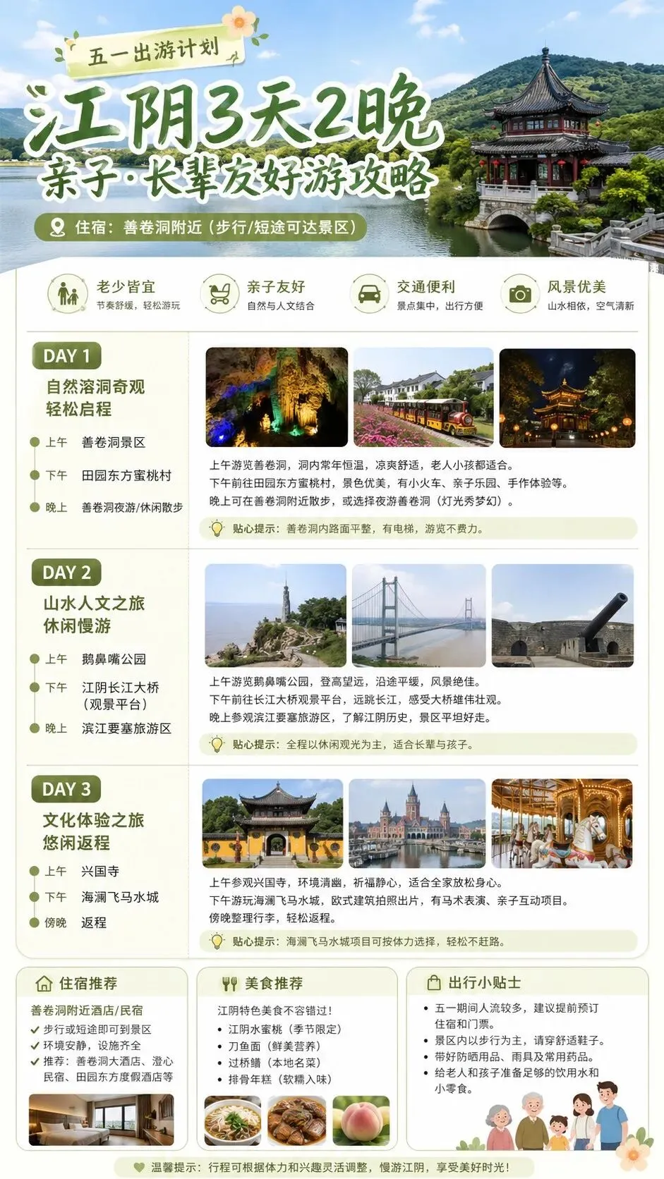 五一计划江阴旅游,帮我规划一份3天2晚的旅游攻略,住宿在善卷洞附近,行程安排要对老人小孩友好,注意文字使用简体中文,不要有乱码,不要有英文。画面比例 9:16 。