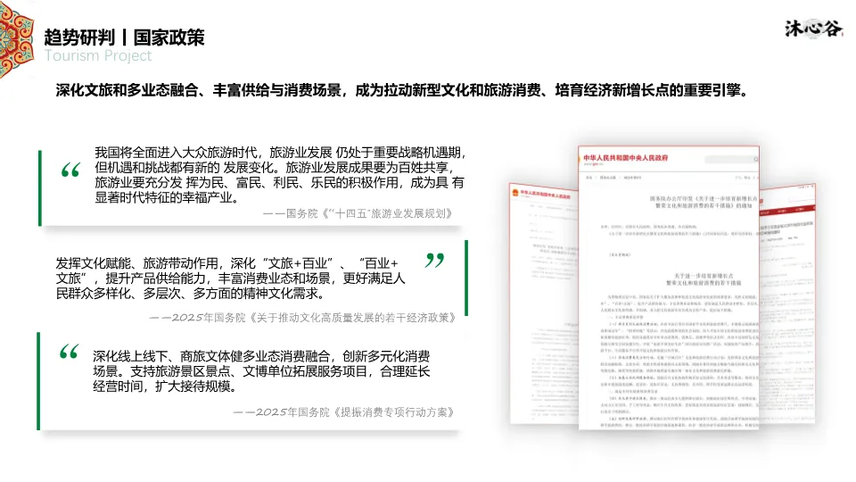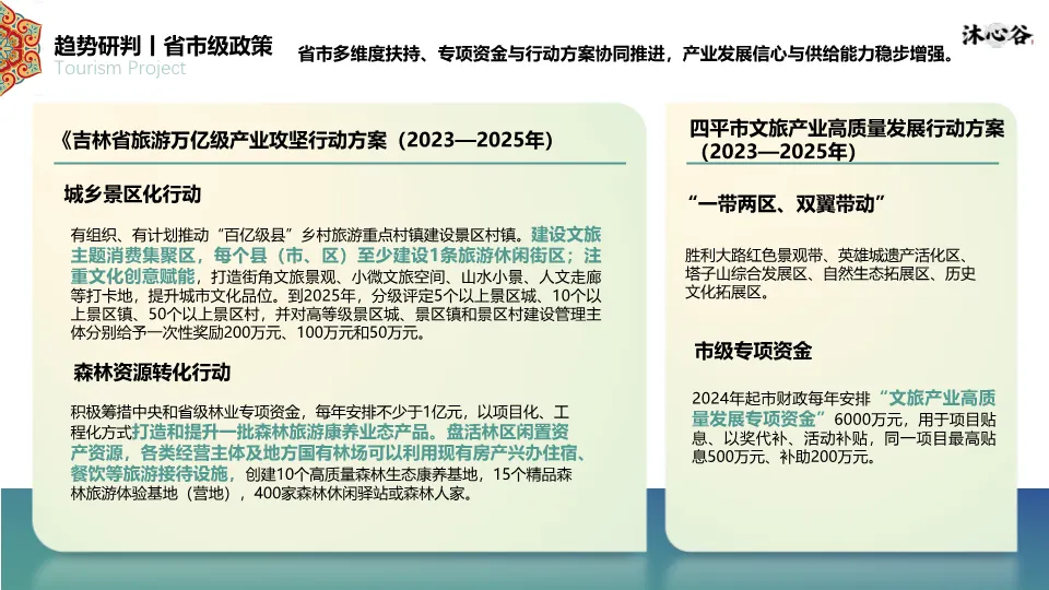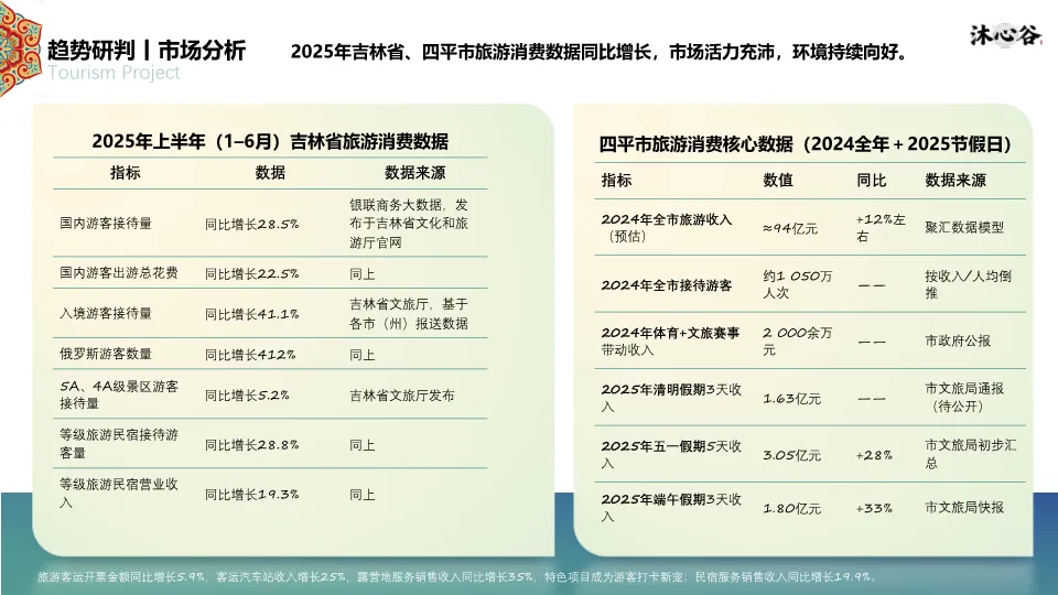 文档指出,在国家及省市政策(如四平市文旅产业高质量发展行动方案、市级专项资金6000万元)支持下,文旅市场强势复苏。2025年文旅发展的新趋势是“消费·跨界·创新”,短途旅游成为主流(占76%),度假旅游将成为下一个风口。吉林及四平市的旅游消费数据(如四平市2025年五一假期收入3.05亿元,同比+28%)显示市场活力充沛,为项目提供了明确的商业路径。