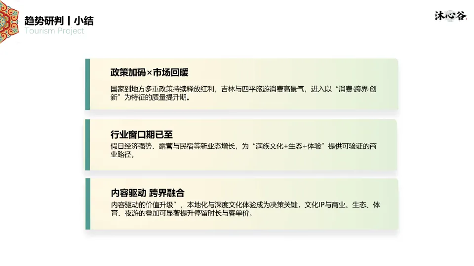 4. 深度体验(研学):构建了三大研学体系:自然生态研学(生态课程、动植物科普、营地课程)、民俗文化研学(满族手工、民俗礼仪、非遗体验)、红色文化研学(爱国教育、历史探秘),以寓教于游的方式延长游客停留时间。