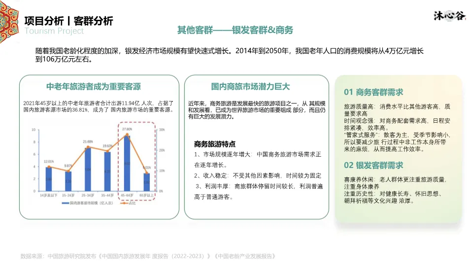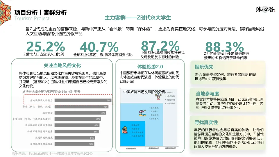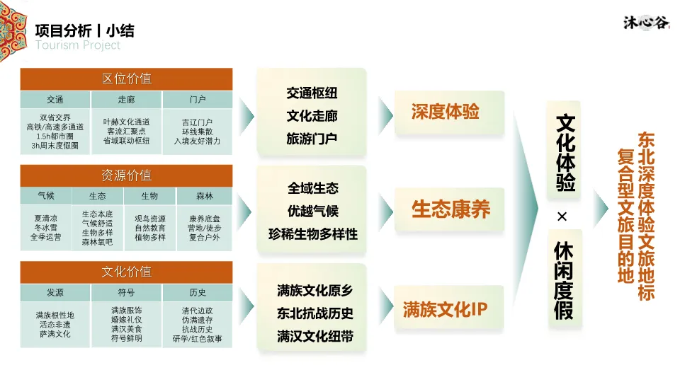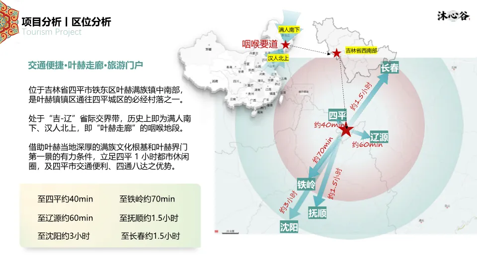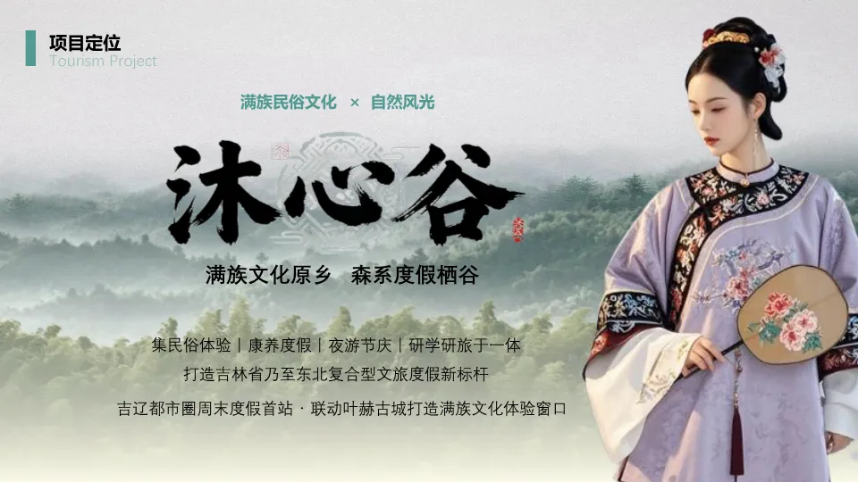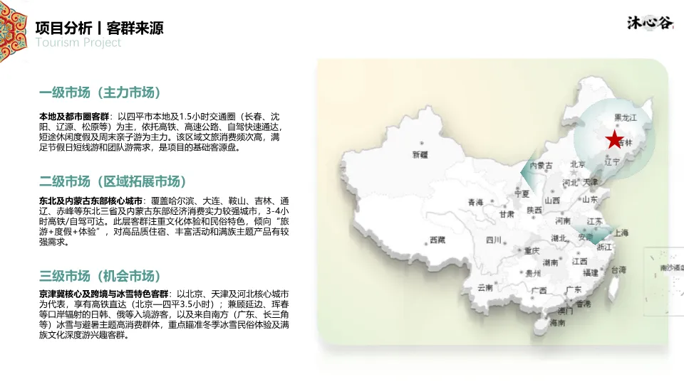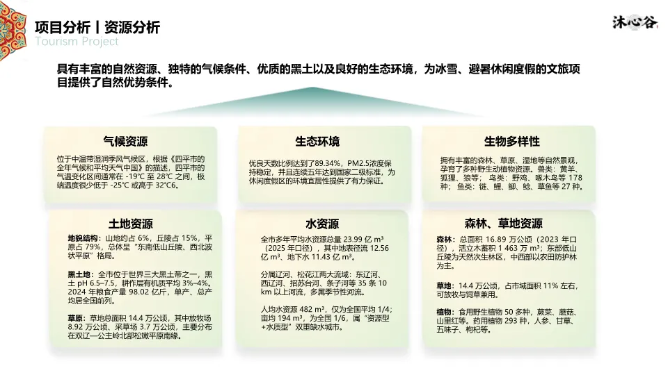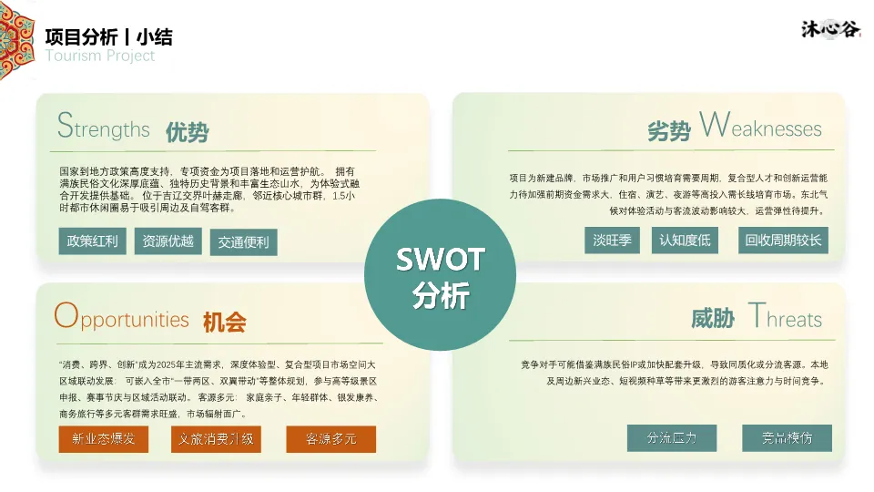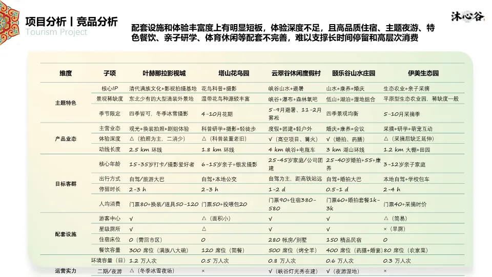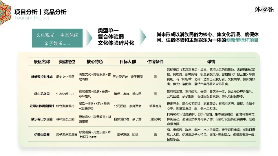 项目位于四平市叶赫满族镇,处于“吉-辽”省际交界,交通便利,是1.5小时都市休闲圈的一部分。资源上,拥有丰富的生态本底(森林、湿地、黑土地)和深厚的满族文化(萨满文化、满族服饰、饮食、婚嫁礼仪)。同时,文档指出竞品(如叶赫那拉影视城、塔山花鸟园等)存在类型单一、体验深度不足、配套不完善的短板,本项目旨在填补市场空白。客群分析聚焦青年&亲子家庭、Z世代大学生、银发及商务客群,他们更追求沉浸式、在地化、情绪价值的体验。SWOT分析明确了政策红利、资源优越、交通便利的优势,以及淡旺季、认知度低的劣势。