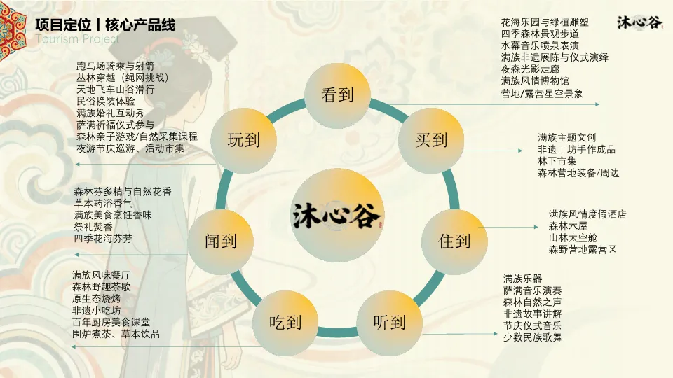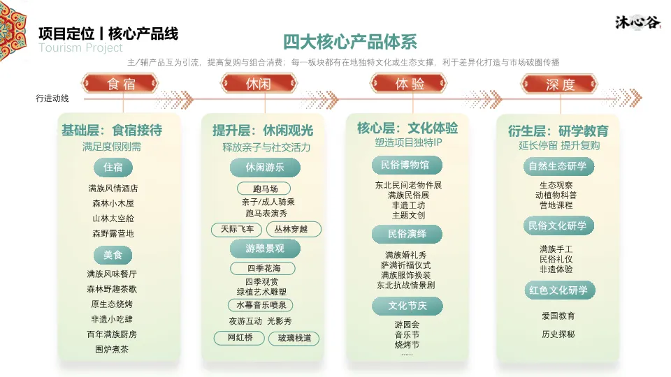 项目定位为“满族文化原乡,森系度假栖谷”,以满族民俗文化×自然风光为核心,打造集民俗体验、康养度假、夜游节庆、研学研旅于一体的复合型文旅度假新标杆。核心产品线围绕“看到、玩到、买到、闻到、住到、吃到、听到”的全感官体验设计,并构建了四大核心产品体系:食宿接待、休闲观光、文化体验、研学教育,形成完善的行进动线。