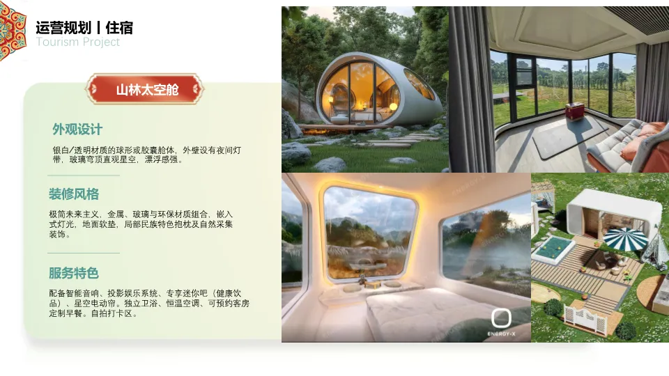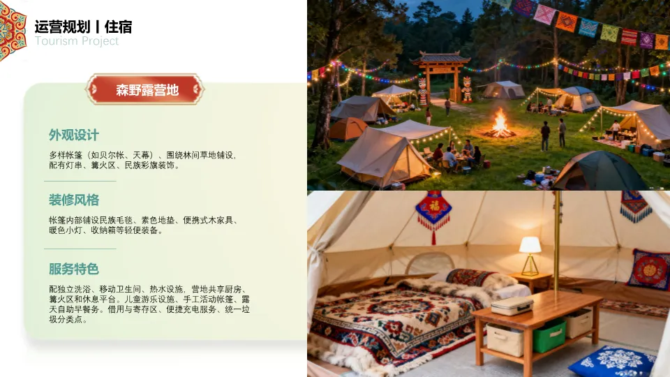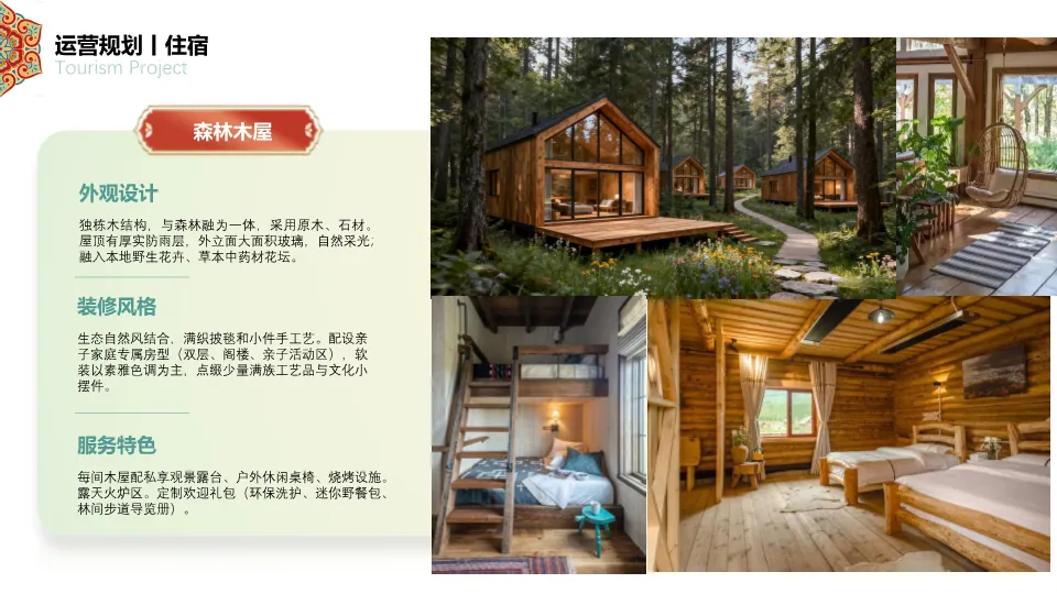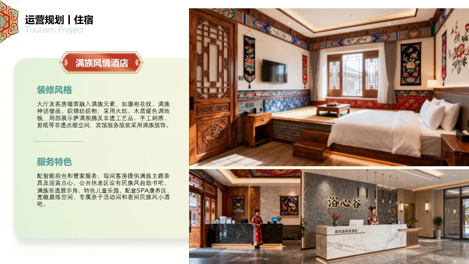 1. 食宿规划:提供满族风情酒店、森林木屋、山林太空舱、森野露营地四种差异化住宿体验,以及满族主题餐厅、露天茶咖、森林营地烧烤、满族小食等特色餐饮,均融入满族元素与生态理念。